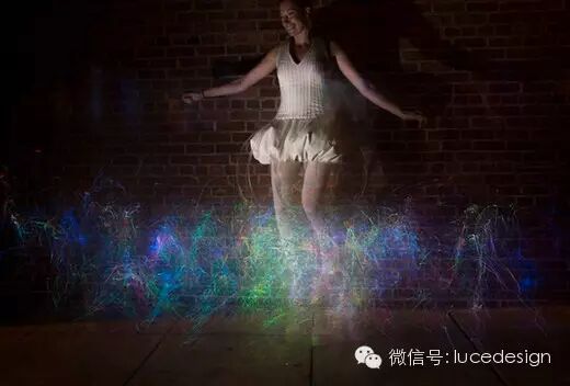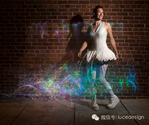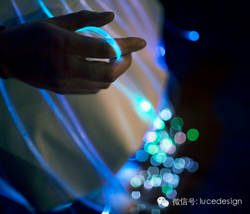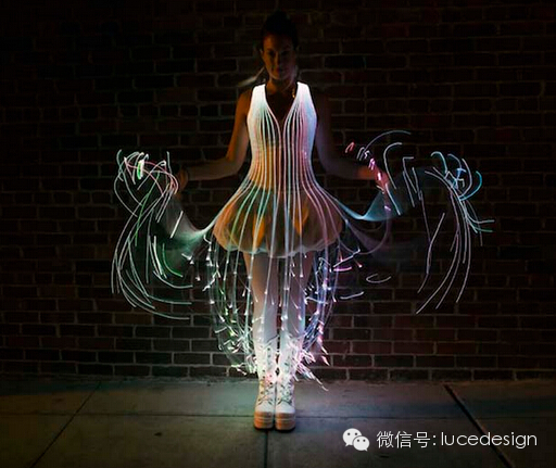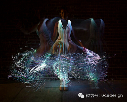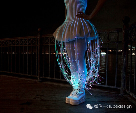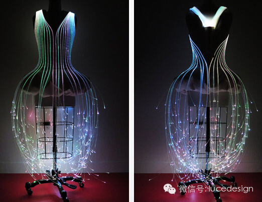 摇动裙摆便形成了俏皮的光束舞姿,而光纤不断地变换色彩在黑暗中称霸,彷彿彩色的萤火虫凝聚在模特儿身上。(来源网络)