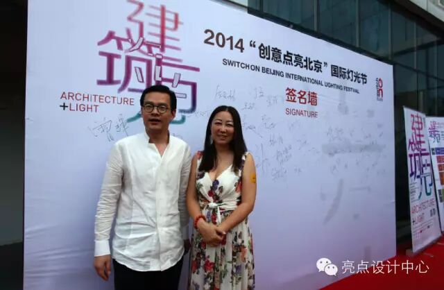 北京国际设计周曾辉主任与“创意点亮北京”国际灯光节策展人丁平在签名墙前合影。