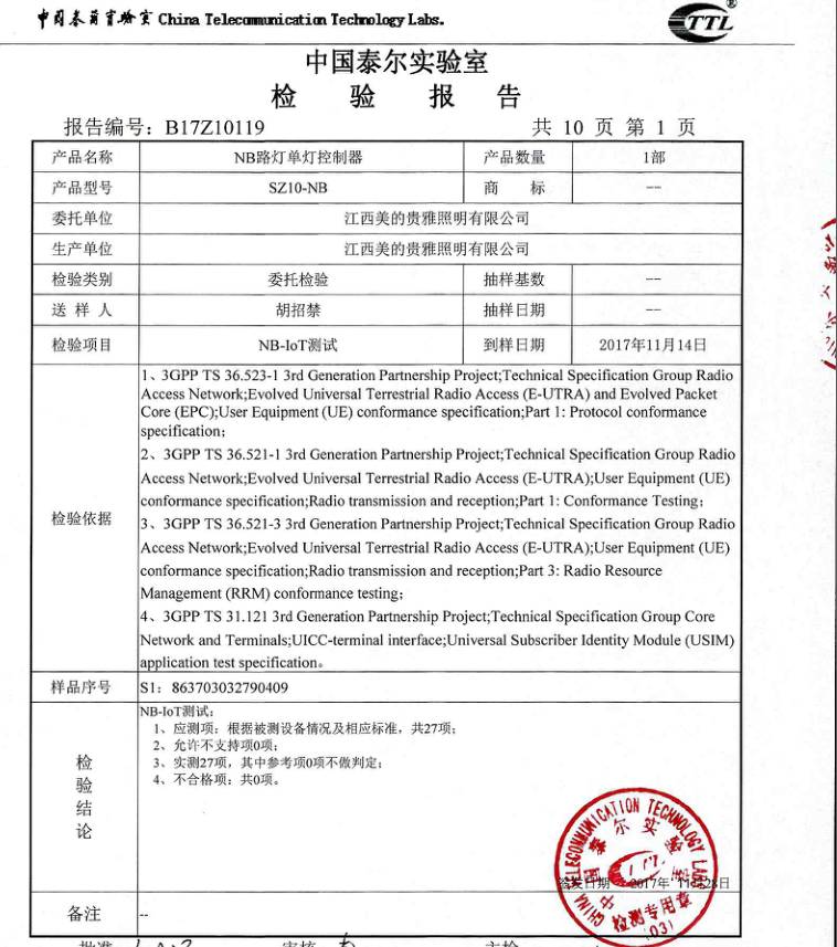 2017年11月28日,美的LED智慧路灯NB单灯控制器成功通过中国泰尔实验室检测,为今后智慧照明领域增加美的方案提供可靠保障。
